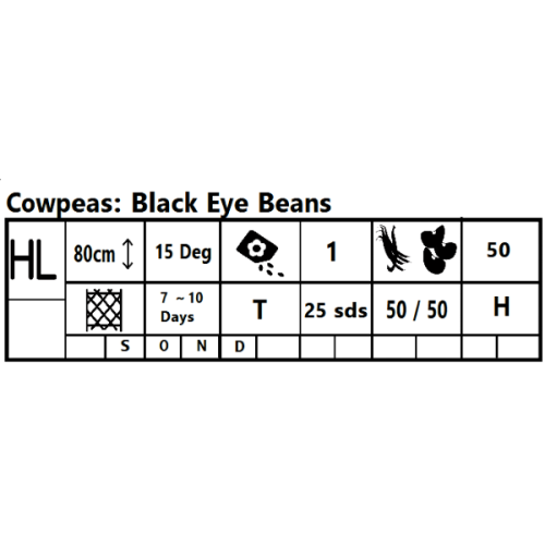 Black Eye Beans are a sub-species of cow peas. AKA Black-eyed Pea, Black-eyed Bean or Goat Pea. On a bean seed, the hilum is callled the ‘eye’, the black spot on the hilum gives this bean its name.